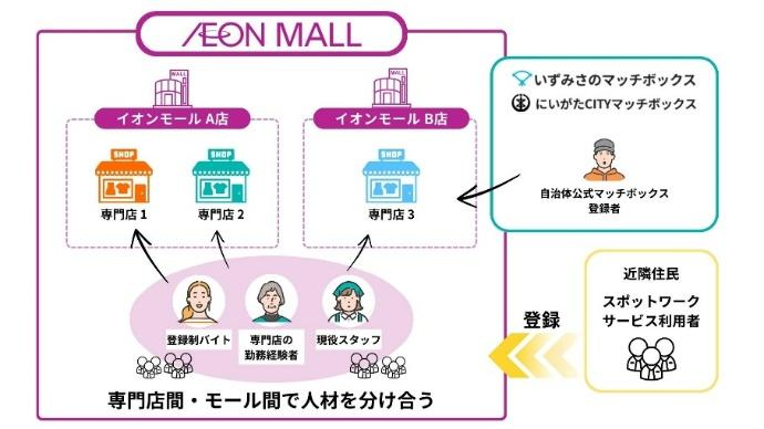 「マッチボックス」は、スキマバイトのプラットフォームです。特許取得済みの独自機能により複雑な税区分の切り替えや休業手当が自動計算されるほか、専門店の業務負担を大幅に軽減するため、採用、労務処理、給与振込までを一元的にサポート。イオンモールが施設全体で人材を確保し、専門店間・モール間で人材を分け合うことで、夫々が人手不足に伴う機会損失の減少を図ると同時に、イオンモール周辺地域の求職者に対しても柔軟に働ける環境を提供いたします。また、イオンモール新潟亀田インター・イオンモール日根野は、新潟市・泉佐野市公式の自治体マッチボックス(にいがたCITYマッチボックス・いずみさのマッチボックス)とも連携し、更なる地域雇用の創出をめざします。