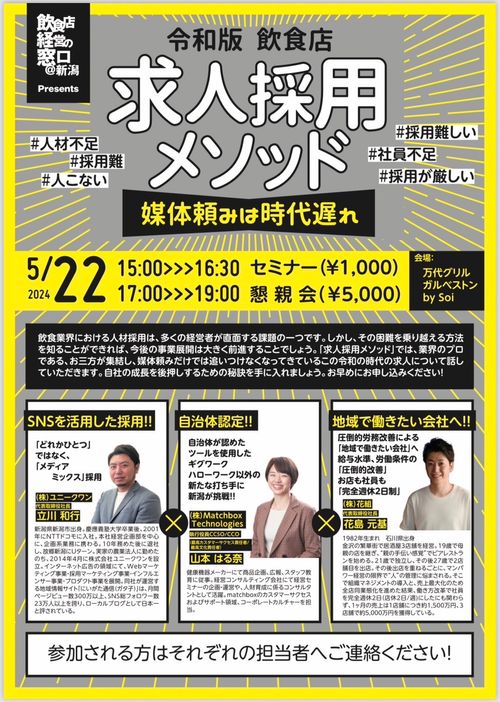 2024年5月22日、「飲食店経営の窓口@新潟」が共催の「令和版 飲食店 求人採用メソッド 媒体頼みは時代遅れ」をテーマとしたパネルディスカッションに、弊社執行役員CCSO/ CCO山本が登壇いたします。